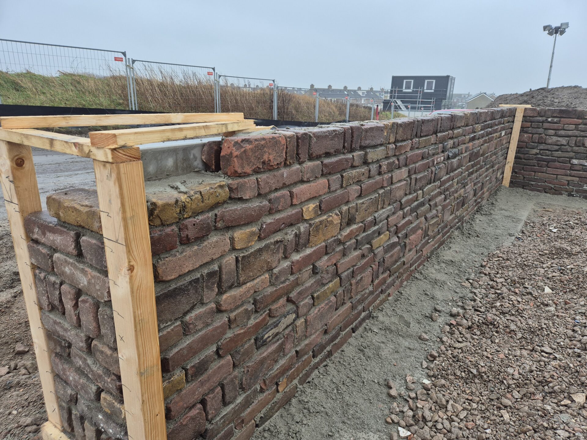 Na het zomerseizoen 2025 sloten we het parkeerterrein af en zijn we gestart met de werkzaamheden. “Ondanks uitdagend weer in de eerste weken, liggen we keurig op schema,” aldus calculator/werkvoorbereider Bart Bluijs. “We braken bestaande verhardingen open, waarvan een deel werd afgevoerd en een deel hergebruikt na schoonmaak en palletisering. De vrijgekomen stenen hebben we opnieuw gebruikt in het metselwerk op de nieuwe keerwanden en in de strekse lagen bij de parkeervakken. De parkeerplaatsen zijn ingericht met waterpasserende stenen en een goed doorwaterende onderlaag bestaande uit grof granulaat om een betere afwatering te krijgen en te garanderen.”